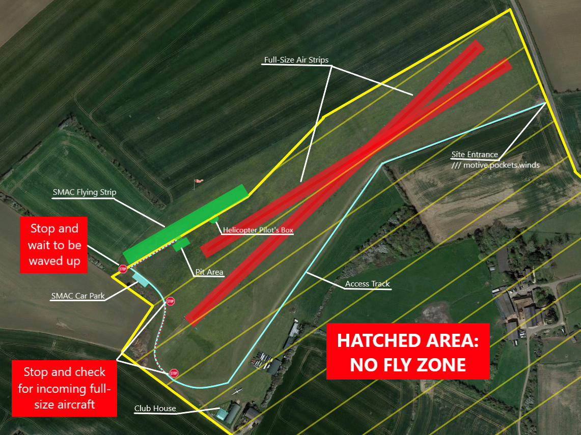 Always stay on the access track down to the clubhouse and do not cross the main runway threshold to the SMAC flying area until you have had a site safety induction from a committee member. Always check thoroughly both ways for full size aircraft taking off or landing. Do not drive from the SMAC carpark to the pits until waved up by the spotter.